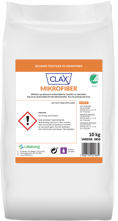 Clax Ultra, 10 kg Sist oppdatert 26 aug 2025 Strekkode (GTIN): 7046110221839 Vis alle GTIN Vis færre GTIN Type: Tekstilvaskemiddel profesjonell Lisensnummer: 2093 0018 Miljømerke: Svanemerket Merkevare: Clax Lisensinnehaver: Lilleborg AS Lisensinnehaver nettside: http://www.lilleborg.no Tilgjengelig i: Norge Se også Svanemerkets krav til tøyvaskemiddel for profesjonell bruk