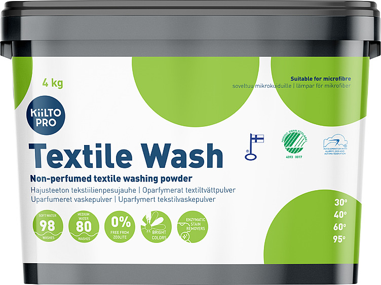 Kiilto Pro Textile Wash, 4 kg Sist oppdatert 01 sep 2025 Strekkode (GTIN): 6417964632620, 6417964632743 Vis alle GTIN Vis færre GTIN Type: Tekstilvaskemiddel profesjonell Lisensnummer: 4093 0017 Miljømerke: Svanemerket Merkevare: Kiilto Pro Lisensinnehaver: KiiltoClean Oy Lisensinnehaver nettside: https://www.kiilto.fi/ Tilgjengelig i: Sverige, Finland, Danmark Se også Svanemerkets krav til tøyvaskemiddel for profesjonell bruk